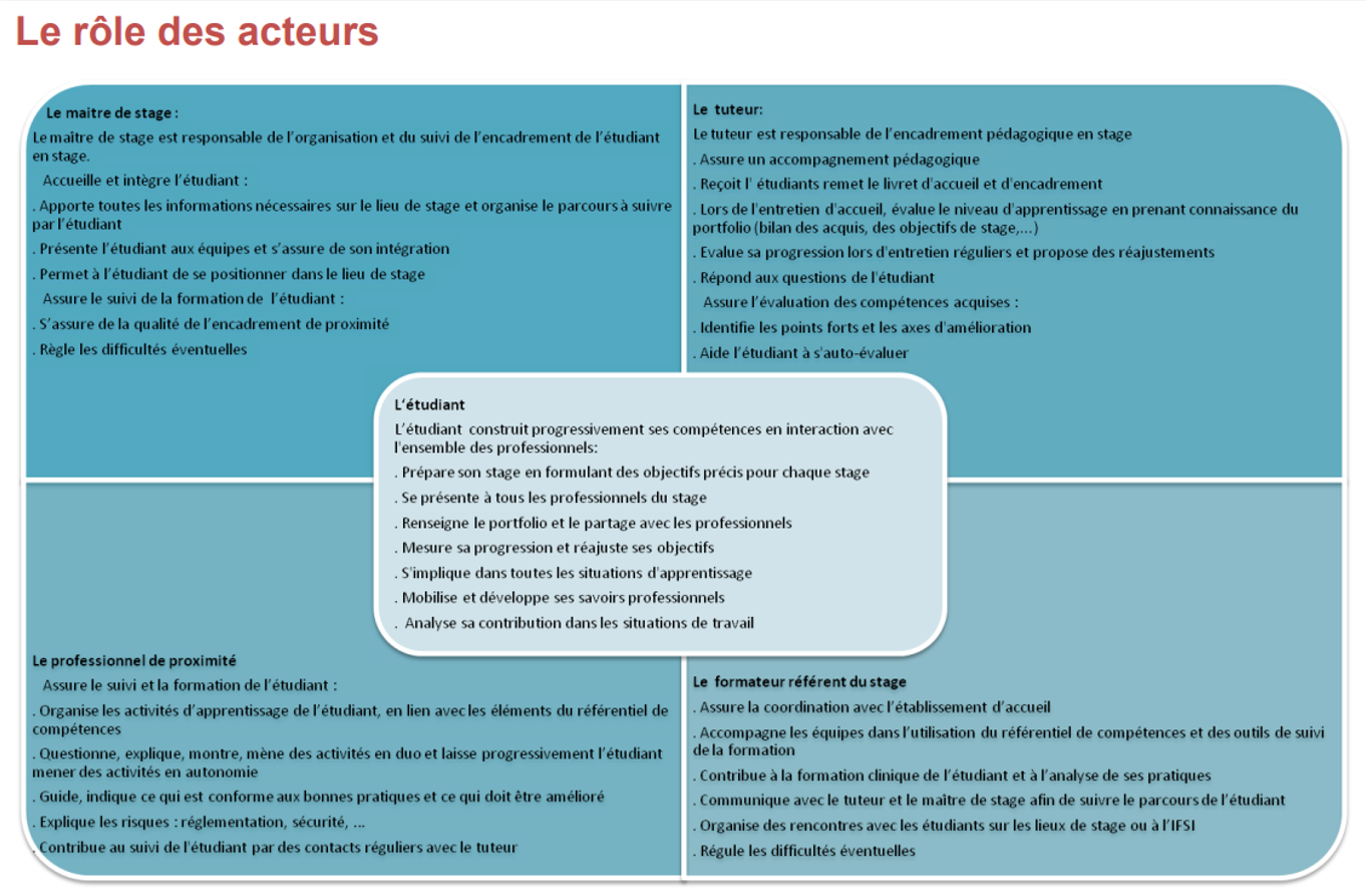 Des encadrants de proximité en stage. Ce sont des professionnels de santé qui font partie intégrante de la formation. Ils interviennent sur le plan clinique dans l’encadrement des apprenants en stage et lors des analyses de situations. Sur le plan théorique, ils participent en fonction de leur expertise en assurant des interventions ponctuelles au sein de l’institut.